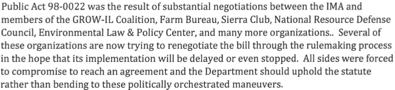 *** UPDATE *** The Illinois Manufacturers’ Association claims that some groups are attempting to use the rules process to renegotiate the bill. From an IMA letter to DNR…