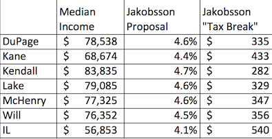 * The folks at A Better Illinois, which is advocating for a graduated Illinois tax and is backed by organized labor, among others, put together actual tax rates for all those suburban counties in the Daily Herald article and compared them to today’s current income tax rate. I’ve adjusted the headings a bit to make it more clear that these are Jakobsson’s proposed rates.