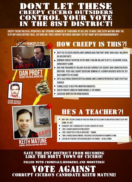 Dan Proft deserves this. He has been using his PAC to take the potshots at his opponents. It is hypocritical with his background in Cicero. About time. The facts about Matune and his history have opened that door.