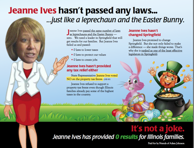 Wait just one minute here…the Adam Johnson advertisement is factually incorrect. Michael Madigan has passed many bills over the years. So, leprechauns do pass bills, and only the Easter Bunny and Jeanne Ives have not. I demand a retraction.