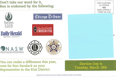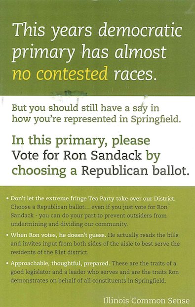 * A political committee that doesn’t seem to be registered yet with the state has sent a mailer to Democrats urging them to vote in the Republican primary for Rep. Ron Sandack…
