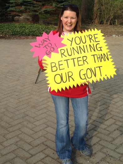 She is cute, she is funny and she isn’t making a statement blatantly original or controversial. She is smiling and having a good time. She is probably cheering everyone as they ran, walked or limped by.