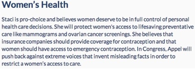 In two sections of her “issues” page, Callis’ entire position on “Women’s Health” and “Alternative Energy” are nearly identical to the positions on the website of Staci Appel, a Democrat running for Congress in Iowa, with the name changed to “Ann Callis” instead.