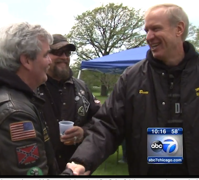 Stop the presses! Rauner shook hands with a biker dude with a conferate flag on his jacket. Is Quinn worried about his African American support?
