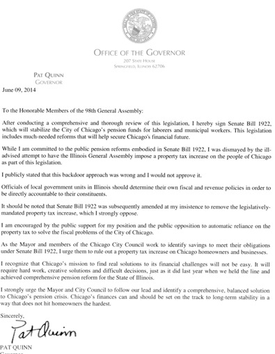 Gov. Quinn had to make a tough choice, and I believe he did the right thing for now, given the very few realistic choices he had. The city couldn’t and wouldn’t do a financial transaction tax, and putting all workers on 401(k) style pensions would not have been feasible either.