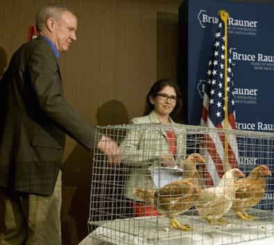 Standing beside a trio of caged chickens, Republican gubernatorial candidate Bruce Rauner says he has a plan to cut $1 billion in “wasteful spending” in state government that calls on lawmakers to forfeit their pensions as they know it, to scrap a state plane system and, among other changes, stop the practice of flying in prairie chickens from out of state.