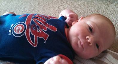 Having had four myself, I consider myself an expert in detecting happiness in babies, and that little one is genuinely happy. No gassy smile there. Go Cubs.
