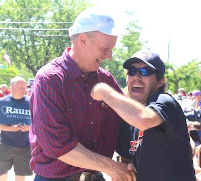 Rauner is quick to check a well wishers t-shirt to make sure it has no flags on it…
