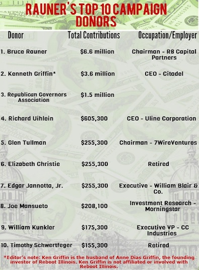 * Reboot took a look at the top ten contributors to Bruce Rauner and Gov. Pat Quinn…
