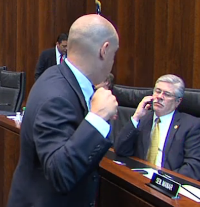 * Rep. Ron Sandack physically illustrates a story to Rep. Fred Crespo during a recess at today’s Legislative Audit Commission hearing…
