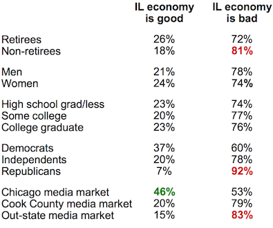 * But the real story here is the deep anxiety levels among the aging and aged. For instance, 61 percent of non-retirees say they have or will delay their retirement for financial reasons. And 76 percent of all of those polled say the Illinois economy is bad, with 46 percent saying it’s “very bad”…