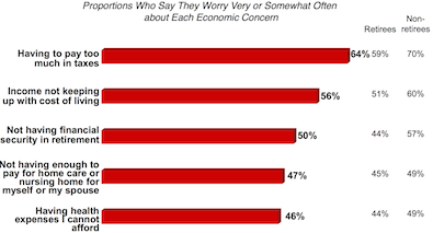 * “Looking ahead to the next five years or so, do you feel more hopeful and confident, or more worried and concerned about being able to achieve your economic and financial goals?” More worried and concerned are in red…