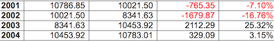 Take a look at the Dow Jones Returns. The market performed well after ERI. Frerichs never factored in the losses in 2001 and 2002. Dow Jones Averages