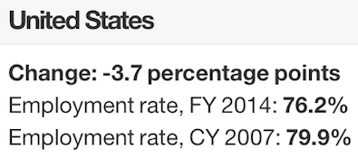 Employment rates for 25- to 54-year-olds were lower in 29 states in fiscal year 2014 than in 2007, before the Great Recession. In 2007, 79.9 percent of people ages 25 to 54 in the United States had a job. In the 12 months ending June 2014, five years after the recession ended, only 76.2 percent of people in that age group were working.
