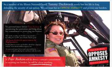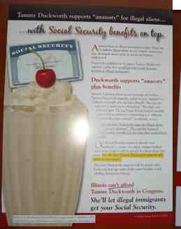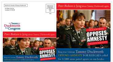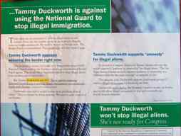 The Republican National Campaign Committee has sent out at least two mailers recently claiming that 6th District Democratic candidate Tammy Duckworth supports “amnesty” for illegal aliens. Click on the images for larger pics.