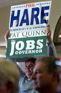 Standing in the back of the room Andy Waeyaert makes sure that Illinois Gov. Pat Quin can see his show of support for the Democratic incumbent during Gov. Quinn’s campaign stop at the Quad City International Airport in Moline on Monday afternoon, November 1. Mr. Waeyaert also held a sign supporting U.S. Rep. Phil Hare who is in a tight race a day before voters head to the polls.