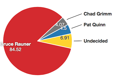 This Reboot Illinois copyrighted poll asked respondents, “If the election for governor were held today, would you vote for Democrat Pat Quinn, Republican Bruce Rauner, or Libertarian Chad Grimm?” The poll is based on automated phone calls with a random sample of 1,064 likely Illinois voters statewide. The poll, conducted by We Ask America on Sept 2., 2014, has a margin of error of +/-3 percentage points. 29% of responses are from cell phone contacts.Party split of respondents: 35% Democrats, 27% Republicans, 38% Independents