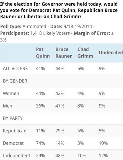 I think we will need a few more polls to get a better sense of where this race is. We had three We Ask America polls within the last month or so, showing a big and steady drop for Rauner. We had the favorable Democratic poll showing Quinn up by 3, and of course the Trib outlier poll, which seems to make no sense, compared with other data.