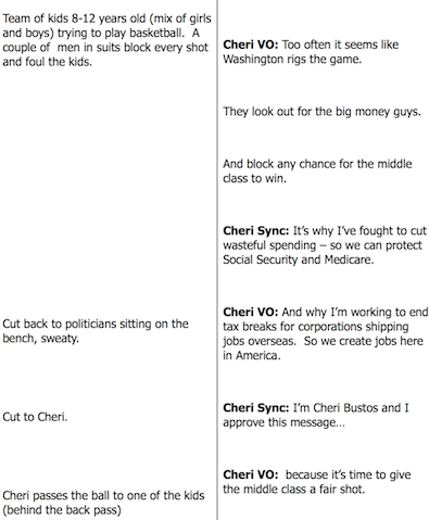 I liked the Bustos ad and its visuals on the surface. But when you consider that Cheri is an incumbent and is already serving in Washington, her “Too often it seems like Washington rigs the game. THEY look out for the big money guys. And block any chance for the middle class to win.” starts to look a bit disingenuous. And what about those big bad guys in suits? Are they big bad Washington guys or are they big bad money guys? Or both? This ad concept would be far better, less muddled, and more effective for a challenger than for an incumbent IMO. C.