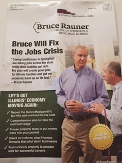Our household received this one. (It was paid for by the Illinois Republican Party.) We are solid D’s; however, my spouse pulled an R in the primary to vote against Bruce. I’m not sure who in the Rauner/IL GOP camp did the mailing list on this, but a solid D in the primaries until this year, is most likely someone who switched to vote against Bruce. Why waste the flier and stamp?