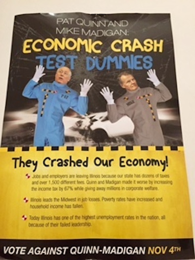 Wouldn’t it make more sense to have the people of the state as the crash test dummies, and Madigan and Quinn as the ones testing their economic policies? I mean, this mailer makes them look like victims of something, not perpetrators!