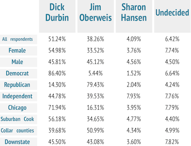 Oberweis, a Republican state senator from Sugar Grove, had a better showing among Chicago and Cook County voters than in a Reboot Illinois poll a month ago, but he also lost ground to Durbin among respondents in the five collar counties and downstate. Libertarian candidate Sharon Hansen was the choice of 4 percent of respondents, with 6 percent undecided.