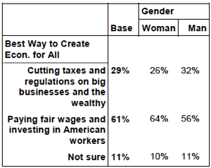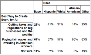 Not sure 10%* Which of the following comes closest to your view? ‘I think the best way to create an economy that works for everyone is by cutting taxes and regulations on big businesses and the wealthy,’ or ‘I think the best way to create an economy that works for everyone is by paying fair wages and investing in American workers’?
