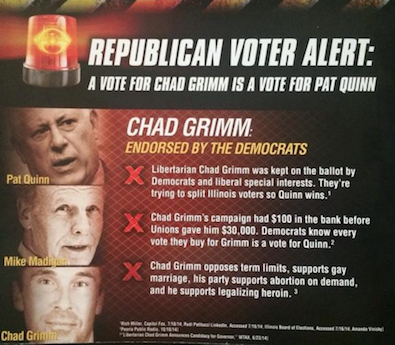 Anon, Chad does NOT support legalizing heroine. Only a candidate as dishonest as rauner would lie on a flier bemoaning ‘dirty politics!’