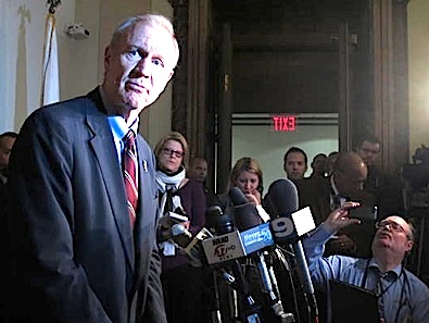 “A sharp eyed photographer catches the last minute that Gov. Elect Rauner was able to meet the press while looking away from the Exit sign.”