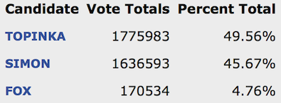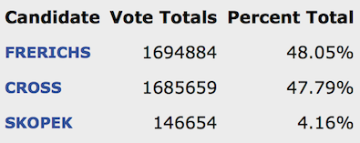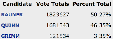 So, Rauner holds onto his majority, Topinka is held to under 50 percent and significantly below her 52.6 percent from four years ago, and Frerichs wins by a mere 9,225 votes…