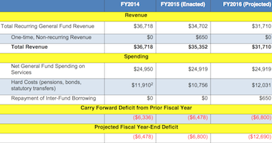 Assuming no tax policy changes, if spending on services in FY2016 is held constant in nominal, non-inflation adjusted dollars at FY2015 levels, the state’s accumulated deficit in its General Fund will almost double, increasing from an estimated $6.8 billion in FY2015, to $12.7 billion by the end of FY2016.