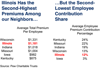 I didn’t see this noted, but the health insurance chart and survey from PEW is based on 2013 average premiums. The State of Illinois negotiated greatly increased premiums and a reduced benefit plan design that took effect in 2014. The chart and 12% average are no longer accurate.