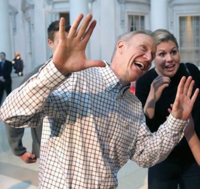 Governor Rauner shows his staff how do the “I love you, you love me” Barney dance/song when addressing him.