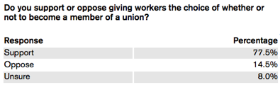 The right question would be: “Do you think workers who are represented by a union should be required to pay union dues or an equivilent fee?”