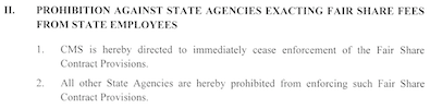 The executive order allows state employees who wish not to support government unions’ activities to stop paying the forced fees. It has no impact on those employees who wish to remain paying members of the union and fund union activities out of their paychecks.