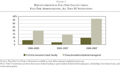 The answer lies in the fact that while the number of students has remained generally flat or grown slightly, the growth in the number of non-teaching administrators has skyrocketed. In the last 25 years, the number of administrators has doubled according to a recent study. Here is a helpful graph to show the problem: