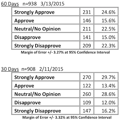 Between 30 and 60 days, Rauner’s combined approval rating only dropped three points, but his combined disapproval rating increased from 26% to 37%.