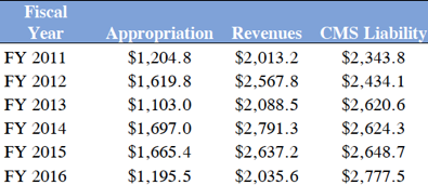 CMS estimates the FY 2016 liability to be $2.777 billion, a 6.8% increase from FY 2015. The CGFA FY 2016 estimate of liability is $2.803 billion, $25.9 million more than CMS.
