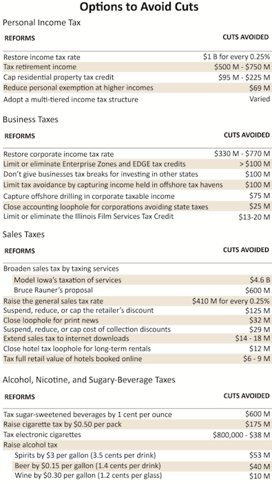 But the Fiscal Policy Center report highlights a broad range of available revenue options, and shows that Governor Rauner and lawmakers have many choices they can make to avoid cutting services for children with epilepsy and autism, police and fire protection, and in-home services for seniors and people with disabilities that help keep them out of expensive nursing homes.