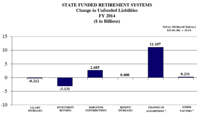 The largest factor was the insufficient employer contributions which caused a $38.7 billion unfunded increase [out of $92.47 billion] during the period under review [start of Edgar ramp in FY 1996 through FY 2014] . Changes in actuarial assumptions; including the changes of interest rate assumptions in FY 2014, caused an additional increase of $19.8 billion