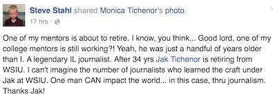 Jak gave me a tour of the SIU school of Radio Television when I was considering SIUC. I did graduate from there, but it was with a degree in Advertising/Marketing. Jak is a staple in the Southern Illinois / Carbondale scene. Seeing him and chatting him up about politics at the Sunset Concerts or in the mid town Schnucks is a regular occurrence. Growing up I remember him presiding over the WSIU pledge drives on channel 8. He is a great teacher, listener, reporter, radio voice, interviewer, writer, citizen, and friend. God Speed Jak, your a connection to the glory days of SIU. You will be missed.