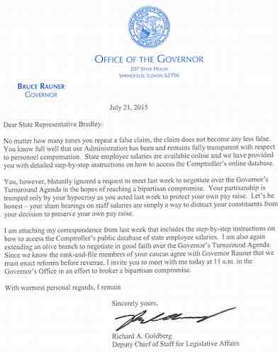 Setting aside Goldberg’s missive for a second, why wouldn’t Bradley agree to meet with Goldberg to debate the details of the Governor’s Turnaround Agenda? Invite the media, have the meeting, let Goldberg and anyone else Rauner wants to designate defend elimining collective bargaining rights and roll-back prevailing wage laws. This is the chance, Goldberg has thrown down the guantlet.