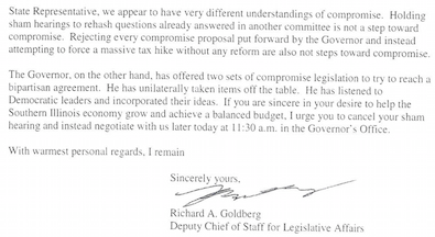 Not sure many noticed, but in another bit of a tweak, Goldberg ended his letter with exactly the same closing salutation as Speaker Madigan.