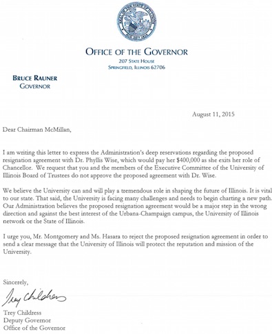 * A letter from the governor’s office urging the three U of I trustees who will vote on Chancellor Wise’s golden parachute to reject it…