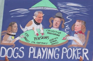 Protester outside #CPS Board of Ed meeting compares #Rahm, #Rauner, Claypool and Madigan to "dogs playing poker." pic.twitter.com/zYTnrZ9xuQ