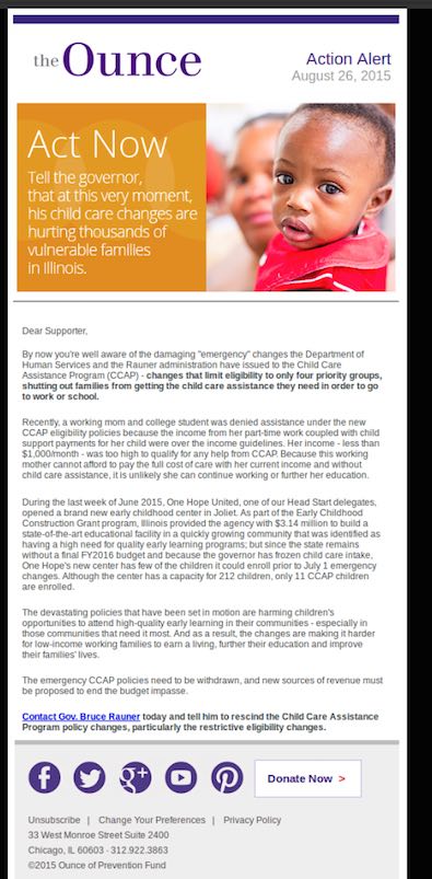 Mama- the action item is “Contact Gov. Bruce Rauner today…” (as seen at the end of the Action Alert.) Emotional, yes- but it’s not an ad. It’s a publication that appears to go to subscribers. And, the emotion is well placed.