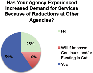The majority of providers (59%) are also experiencing an increased demand for services because of the unavailability of other services once provided by other agencies. In addition, the vast majority of providers (85%) are concerned about how the absence of state funds could impact their ability to provide matching funding for federal dollars.