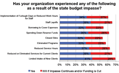 These well paid executives responding to a survey claim these occur because of the budget impasse. These are no longer charities but government contractors upset the government no longer funds them. Boo Hoo.