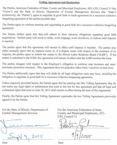 * Maybe the governor has been sincere about negotiating in good faith. Extending the tolling agreement indefinitely and [re-committing] to submitting any disagreements over whether an impasse has been reached to the ILRB, even though Rauner now controls the ILRB, seems reasonable to me.