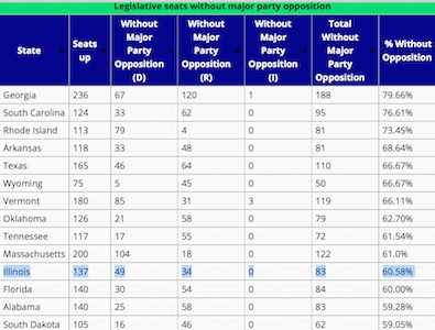 ==60 percent of [Illinois] state legislators faced no opposition on the ballot==